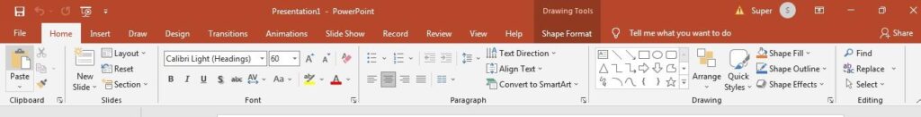 On the Ribbon under the Home Tab, contains a text editor and the new slide icon. The Home Tab contains icons such as Paste, Cut, Copy, Format and Layout.