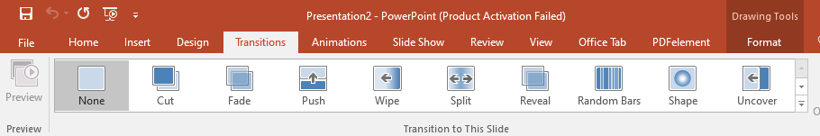 To add a Transition into your Presentation select the Transition Tab. You are then given a Variety to choose from “Fade”.